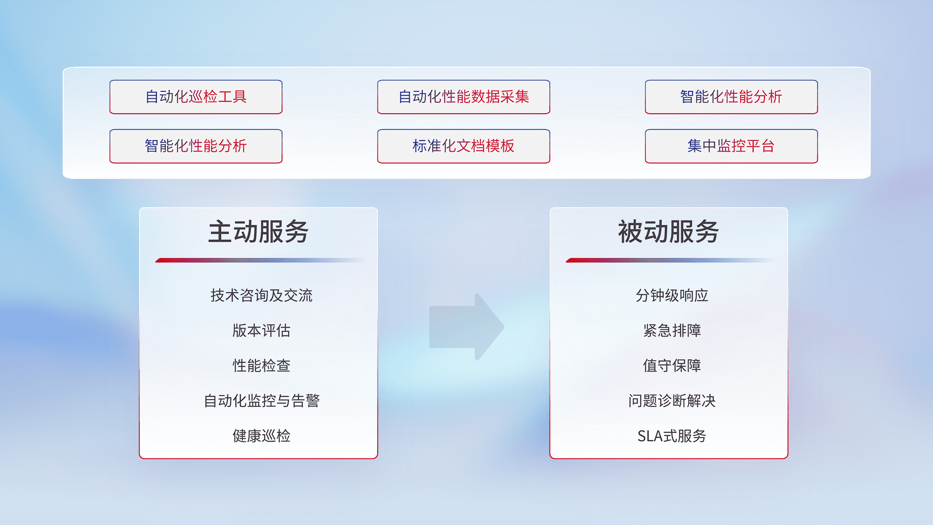 智能化工具和标准化文档,,保障服务质量,,,提供主动服务(包含技术咨询、、版本评估、、、性能检查、、、自动化监控与告警、、、健康巡检)和被动服务包含(分钟级响应、、紧急排障、、值守保障、、、、问题诊断解决、、SLA服务)。。。。